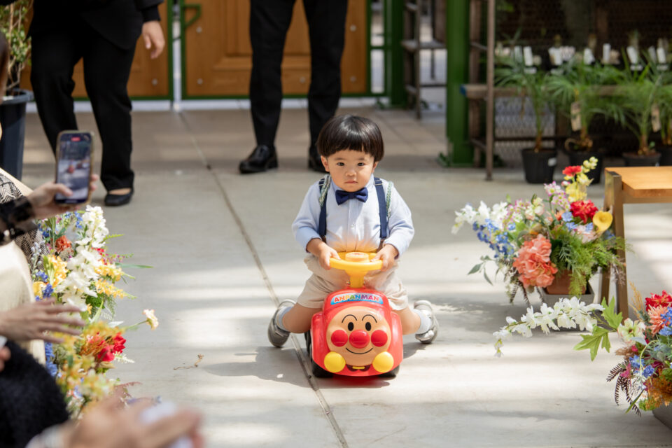 挙式のリングボーイは長男に大好きな車に乗って登場してもらうと 人の多さも全く気にせず猛スピード!笑いに包まれる挙式に^^