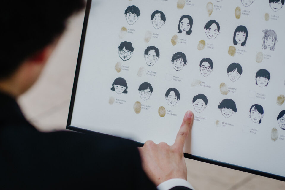 ゲストひとりひとりの似顔絵が書かれた結婚証明書、ひとりひとりにデザインにされた席札、新郎さん力作の高クオリティなムービー・・・などなど