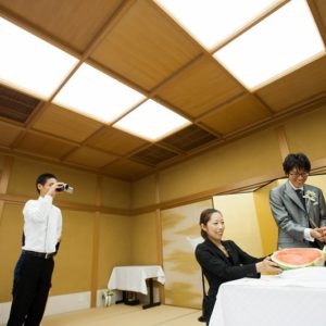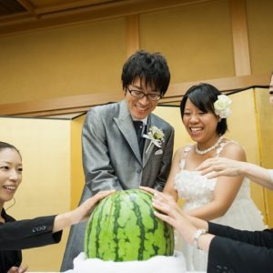 ご親族様中心のパーティだったので夏を感じ、元気に過ごして欲しい という想いから夏野菜がたくさん登場する1日でした♪ すいかカット・夏野菜セットプレゼントのイベント・ブロッコリー&マヨネーズプレゼントなど、さまざまなお二人のアイデアづくしのパーティでした!!