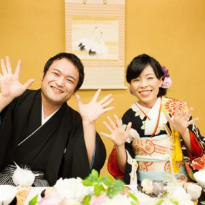 和装がとてもお似合いなお二人♡いつも笑顔で、仲良しなお二人を見ていると本当に癒されます。挙式当日は、お天気にも恵まれ夏らしい素敵な1日でしたね。お二人のお気入りの苔玉のリングピローは、飾ってますか?これからも二人で支え合って、幸せな家庭を築いていってくださいね!
