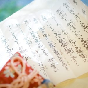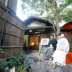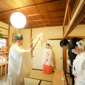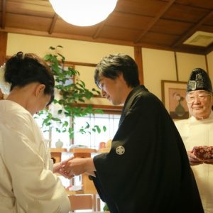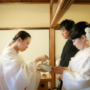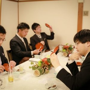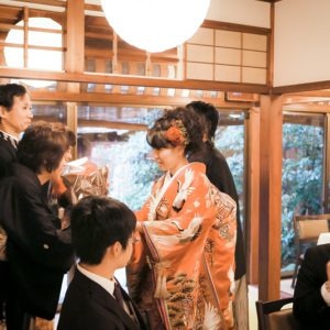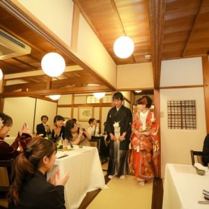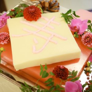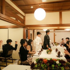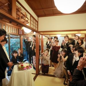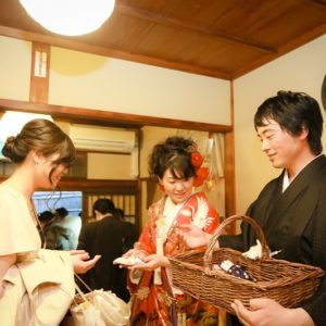 皆様の移動の負担を少しでも減らしたいと神楽家での宴内神前式をお選びになったおふたり。和装で一日過ごされたおふたりは会場の装花やアイテムを和で統一していきたいとの希望でケーキ入刀ではなく神楽家ならではの羊羹ケーキに入刀されました。