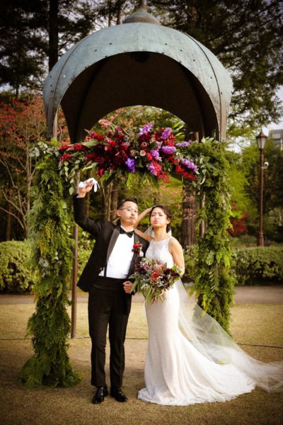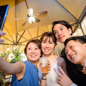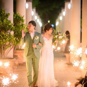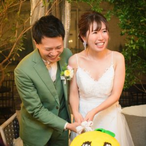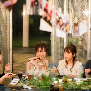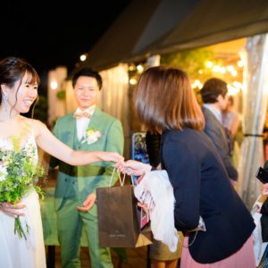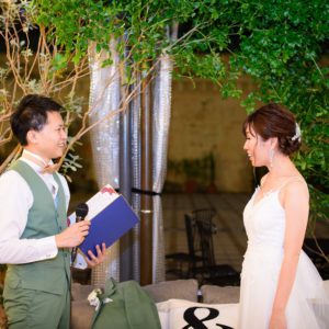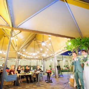 ライトや緑がいっぱいの装飾、開放的な夜のガーデン挙式、本当におふたりらしい1日でした。