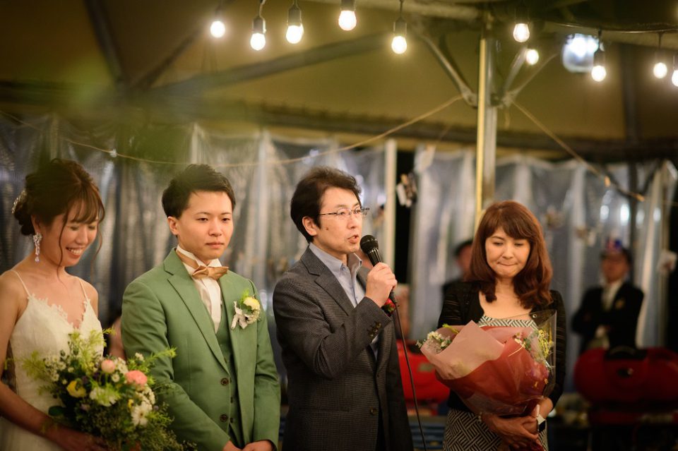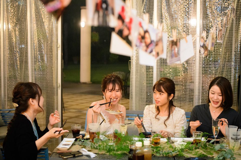 ライトや緑がいっぱいの装飾、開放的な夜のガーデン挙式、本当におふたりらしい1日でした。