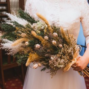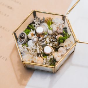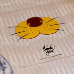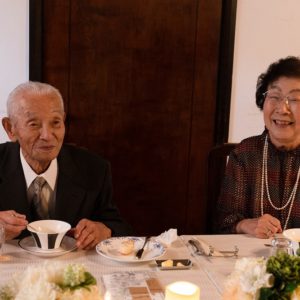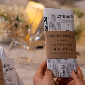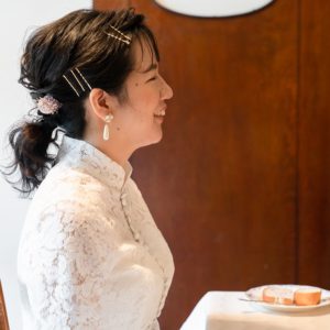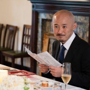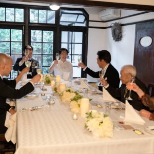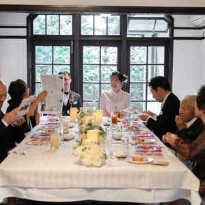 ご家族のみの7名で行いました。挙式は、「今までの感謝」と「これからの誓い」を伝える式にしました。家族へこれまでの感謝の想いを伝え、また、1番近くで見守ってきてくれた家族の前だからこそ、これから夫婦として歩んでいく誓いの場面を1番近くで聞いていただました。会食では、家族みんなで食卓を囲むイメージで配席を組み、新郎新婦の生まれ年の誕生日新聞を置いたりアルバムを回したり、とても温かく和やかな一日でした。また、弊社オリジナルのトークシールドも使用!フォトアイテムとしても大活躍でした!
