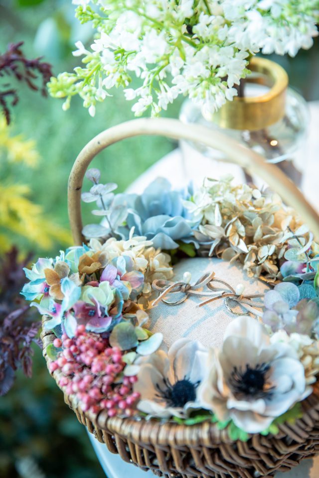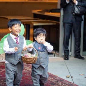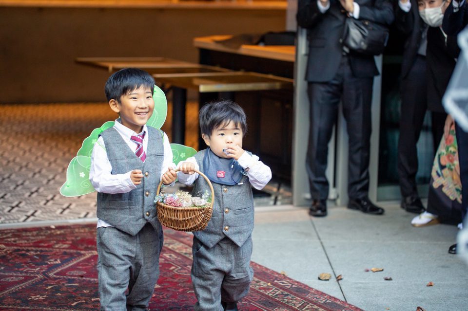 挙式のスタートは、ゲストの皆さんの想いがこもったお花を一輝さんがひとつひとつ集めていくシーンから始まります。お花が大好きな莉子さんらしい結婚証明書や、可愛いリングボーイにも登場してもらい、心温まる可愛い挙式となりました。