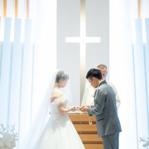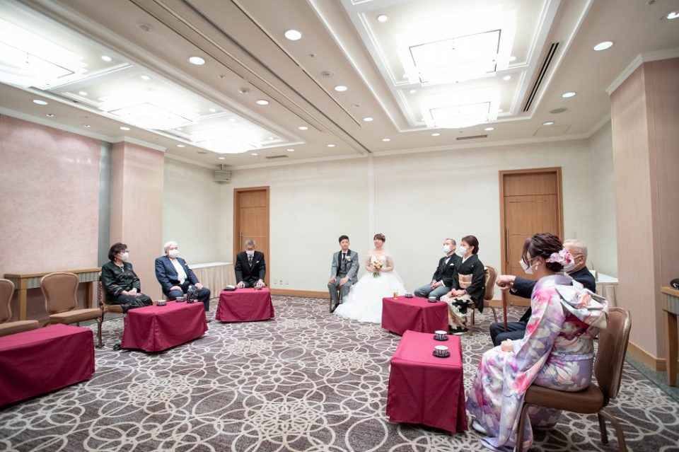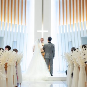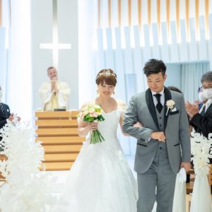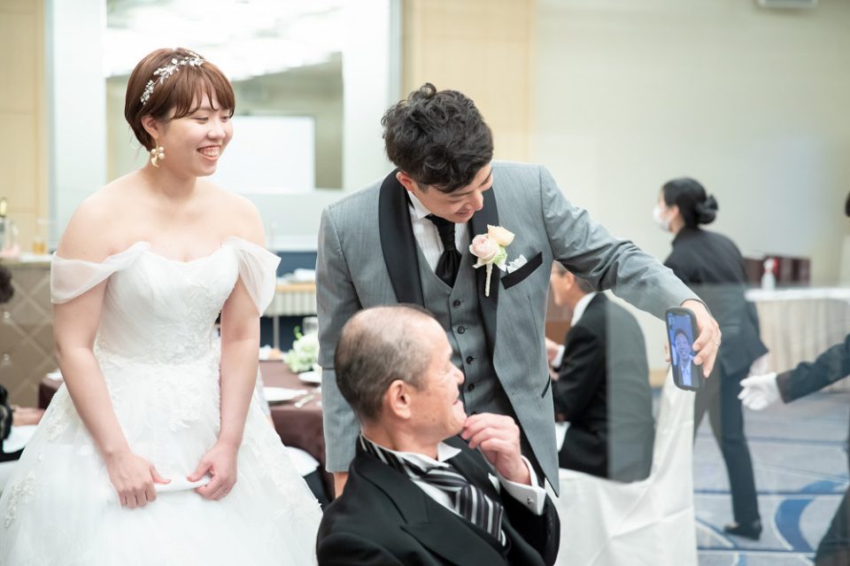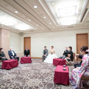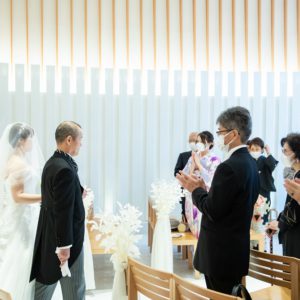 ご家族だけの温かい式とお食事会を望まれたおふたり。 厳かなチャペルでの挙式は、ご家族が見守る中執り行われました。 会食では、来られるはずだった方とテレビ電話をしたりと、和やかに過ごされました。