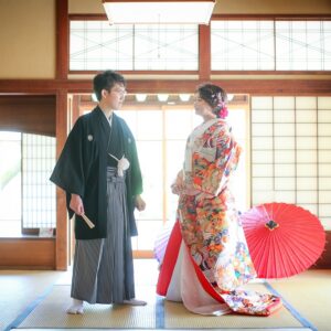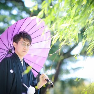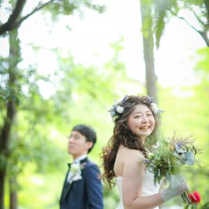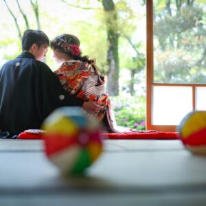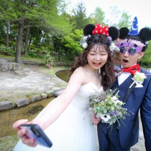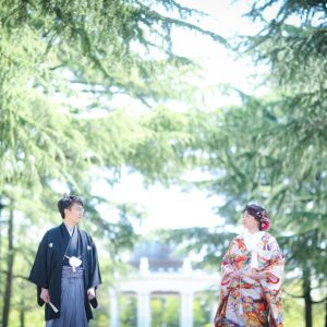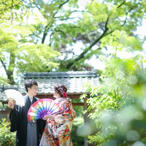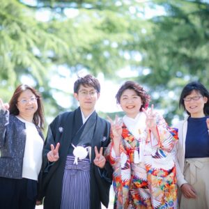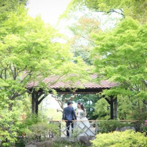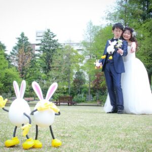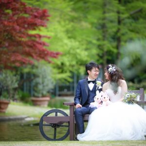 和装は雰囲気のある茶室やお庭で撮影。 洋装では開放的なガーデンでおふたりらしい、大好きなキャラクターのアイテムを使用してのショット。 親御様にもお越し頂き、おふたりの自然な表情も撮影する事が出来ました。