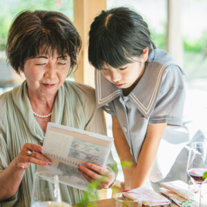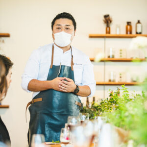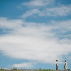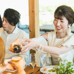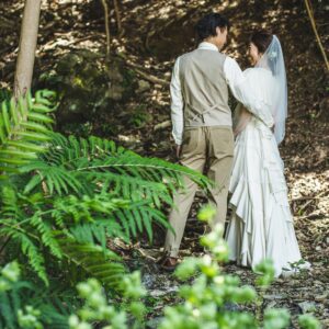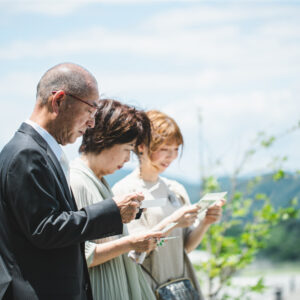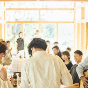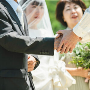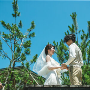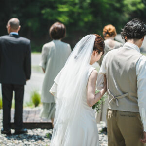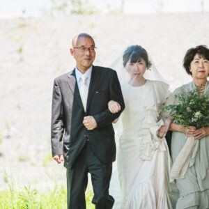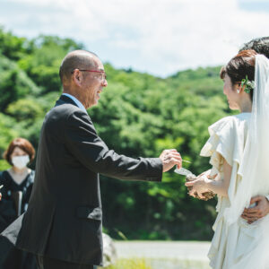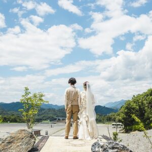 場所はどこでもいいけれど、家族に感謝を伝える機会にできたら。せっかくなら、家族で泊まれて、一緒に思い出をつくれたらいいなという想いからVISONにあるRINNEでの結婚式を。当日は晴天に恵まれて、1000年以上前と変わらない熊野の山々をバックにセレモニーを。