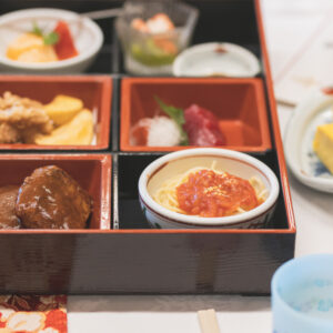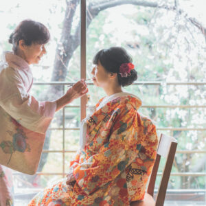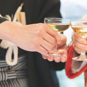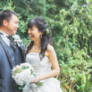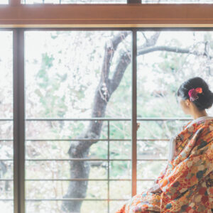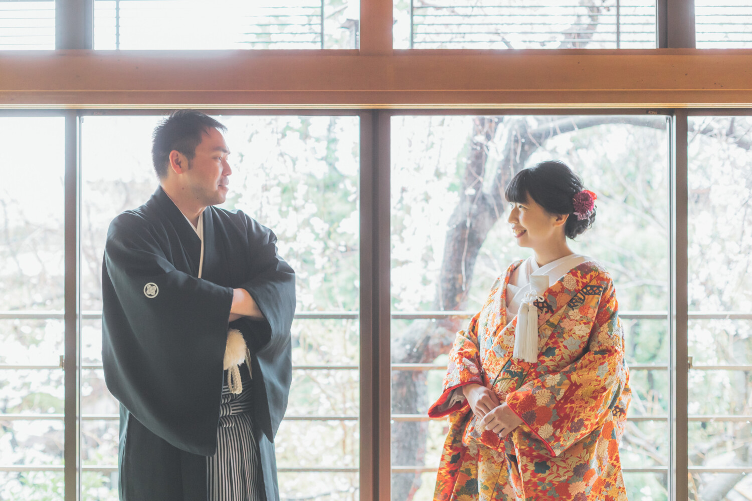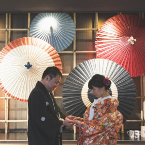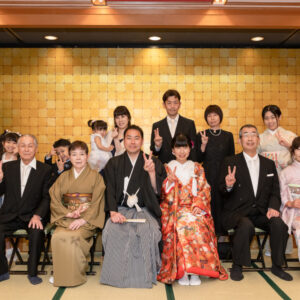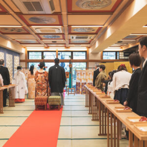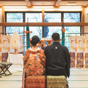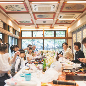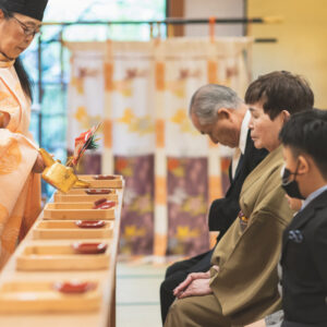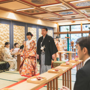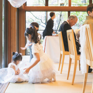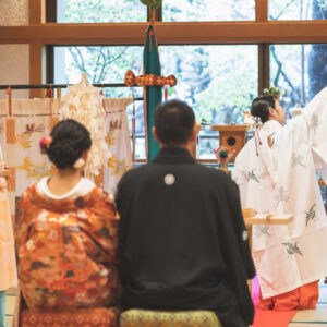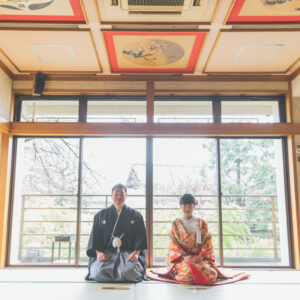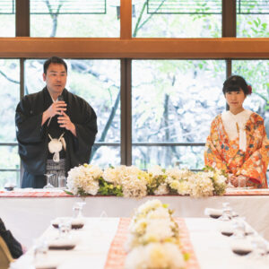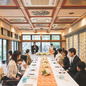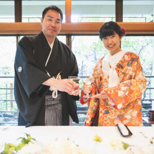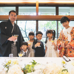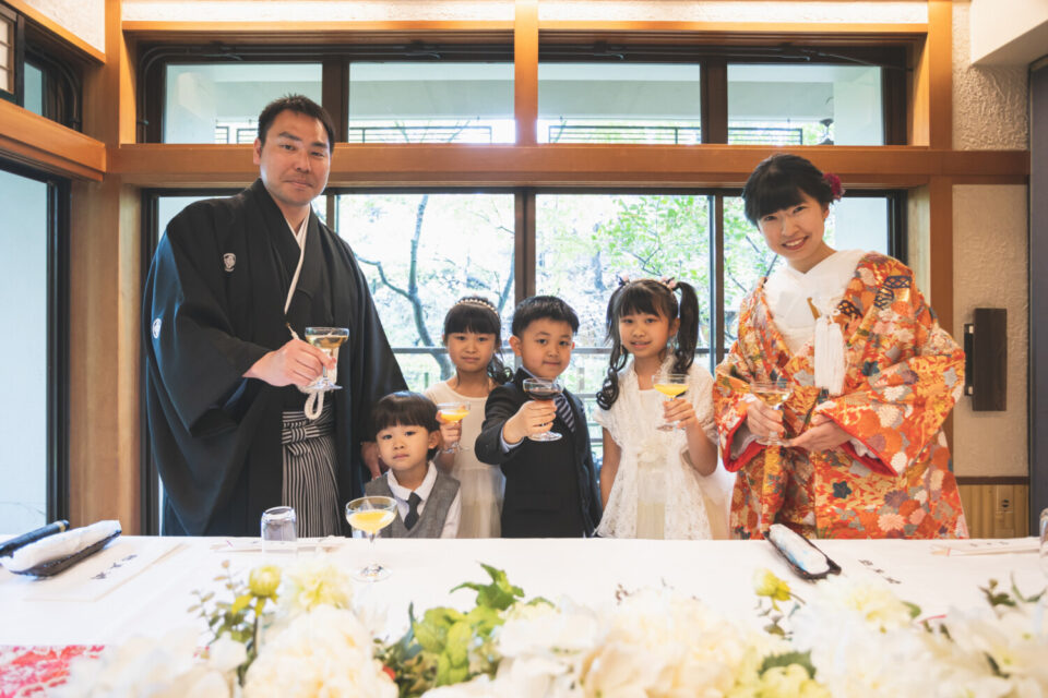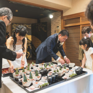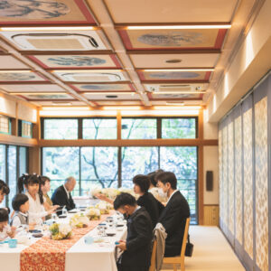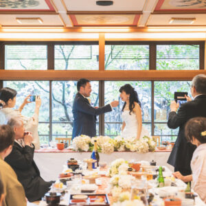 甥っ子や姪っ子も多く、ゲストに気兼ねなく、リラックスして過ごしてほしいというおふたりは、料亭賀城園での会食をお選びになりました。桜の季節の、庭園は、会食をしながらお花見もできる、とてもいい季節。同じ1階フロアでの神前式を行い、その後隣のスペースでの会食会。移動も少なく、おいしいお料理でのおもてなしをメインに、リラックスして過ごされました。ドレスにお着替えになられてからは、和菓子ブッフェで、ゲストに好きなデザートを選んでいただく演出も。お子様も自由に動ける安心のスペースに、ご家族団らんのお時間をお過ごしいただけました。