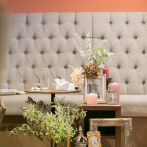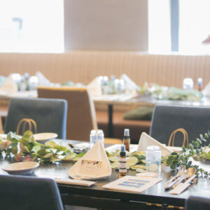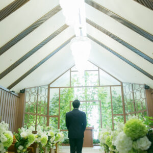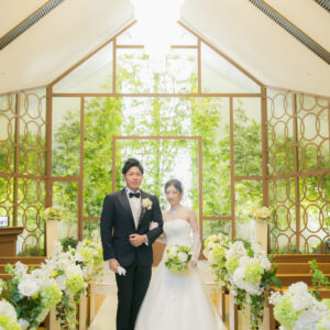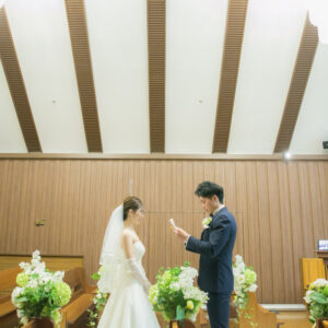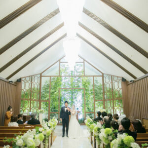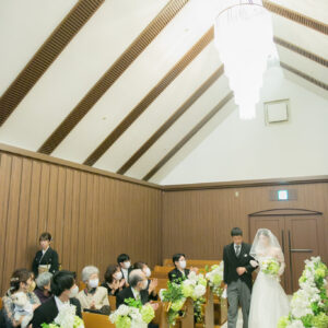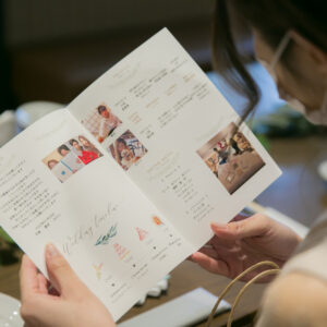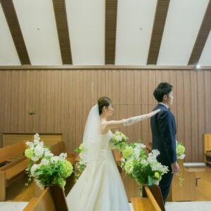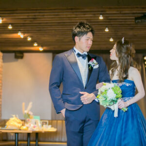 挙式はワンちゃんにも挙式に参加してもらえる会場をセレクト。親族のみの参加にし、メッセージムービーなどを使って、しっかり感謝を伝える場を作りました。一方パーティーはカジュアルな雰囲気で楽しく過ごされたいというご希望から、親族・友人をご招待し、空気感・雰囲気を変えました。友人へは気持ちを伝えるメッセージカードをご用意しました。