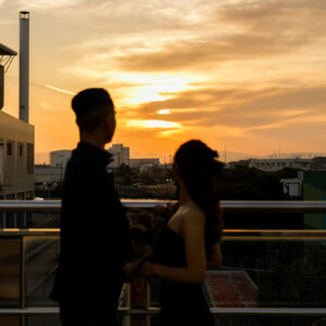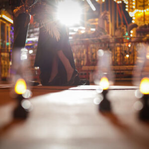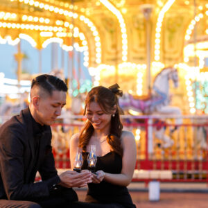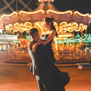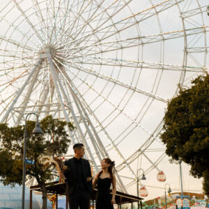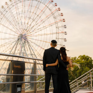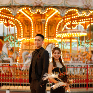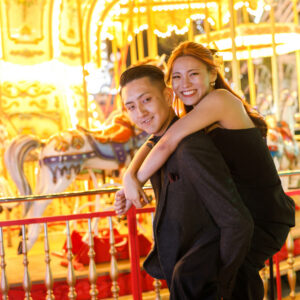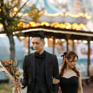 私たちらしいところってどこだろう。。そこから始まったフォトフォトウエディングの場所探し。山よりは海。でもなんか違う。そこで提案させていただいたのが夜の遊園地。黒ドレスとタキシードでかっこいい二人の世界観に。