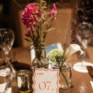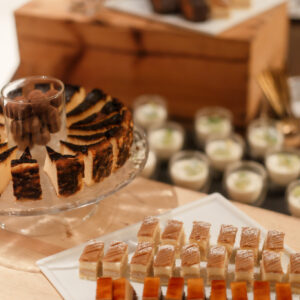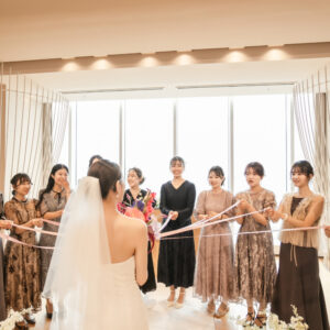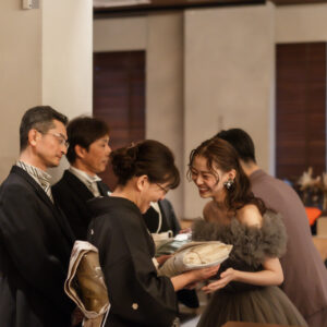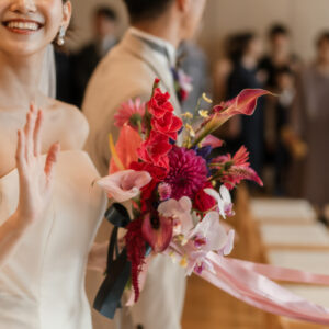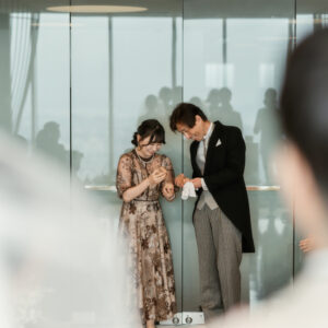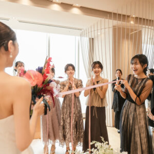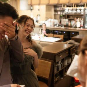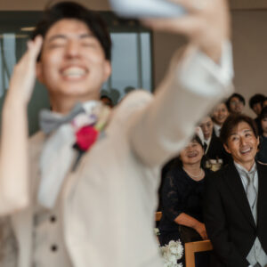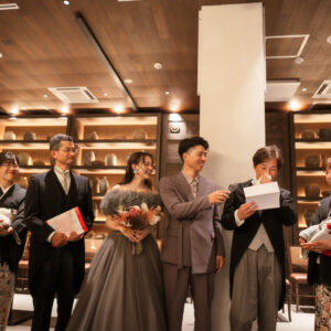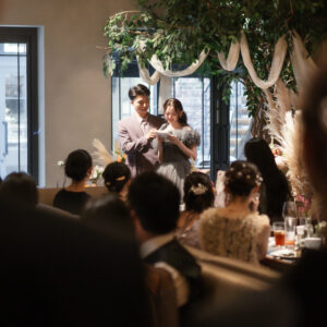 挙式から楽しく二人らしく!をテーマに、誓いの言葉(家訓)をゲストにも協力してもらい創り上げたり、ブーケプルズやゴムパッチンで幸せのおすそ分けをしたり、パーティーではギフトビュッフェやデザートビュッフェでお腹も心も満たされるようにおもてなし。とにかくゲストのことを考え作り込んだ1日でした。だからこそこの日は曇り空を吹き飛ばすくらい明るい笑顔が多く、あとから見返す写真もとにかくゲストや二人が笑っている写真ばかりでした。