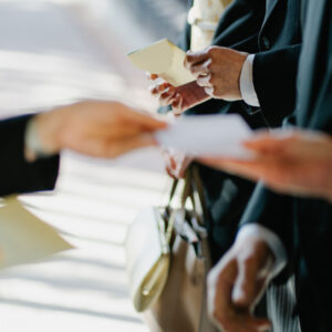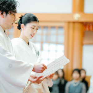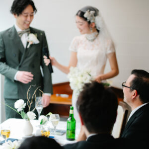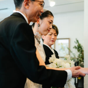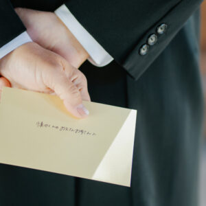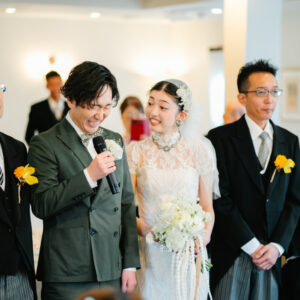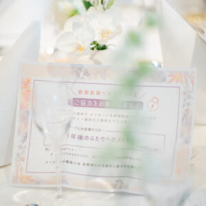 ご退場前には、おふたりの幸せな未来に向けて、お互いへ誓いの言葉を届けていただきました。出会ってから・そしてこれからどんな夫婦でありたいか未来に向けて、ふたりの心が通い合い、お互いだけに届けるべく、あえて黙読で行いました。