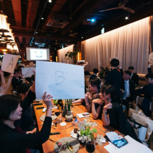 パーティはガラッと雰囲気を変えて、美味しいお食事とドリンクと共にお楽しみにいただく時間に!格付けイベントを実施し、本物の一流を見極めながらゲスト参加型でワイワイした空間の中で過ごされました。