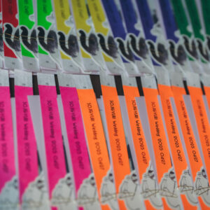 受付でエスコートカードとしてリストバンドを配布し、フェスに来たような気分を感じていただきながら会場に入ると華やかなお花がお出迎え!