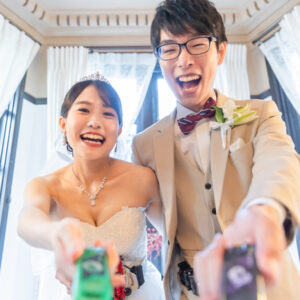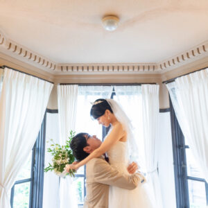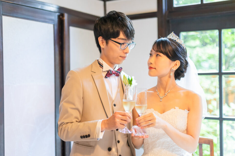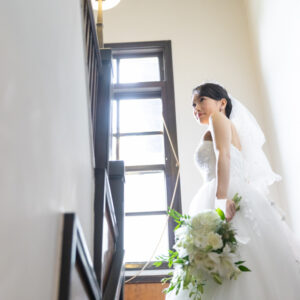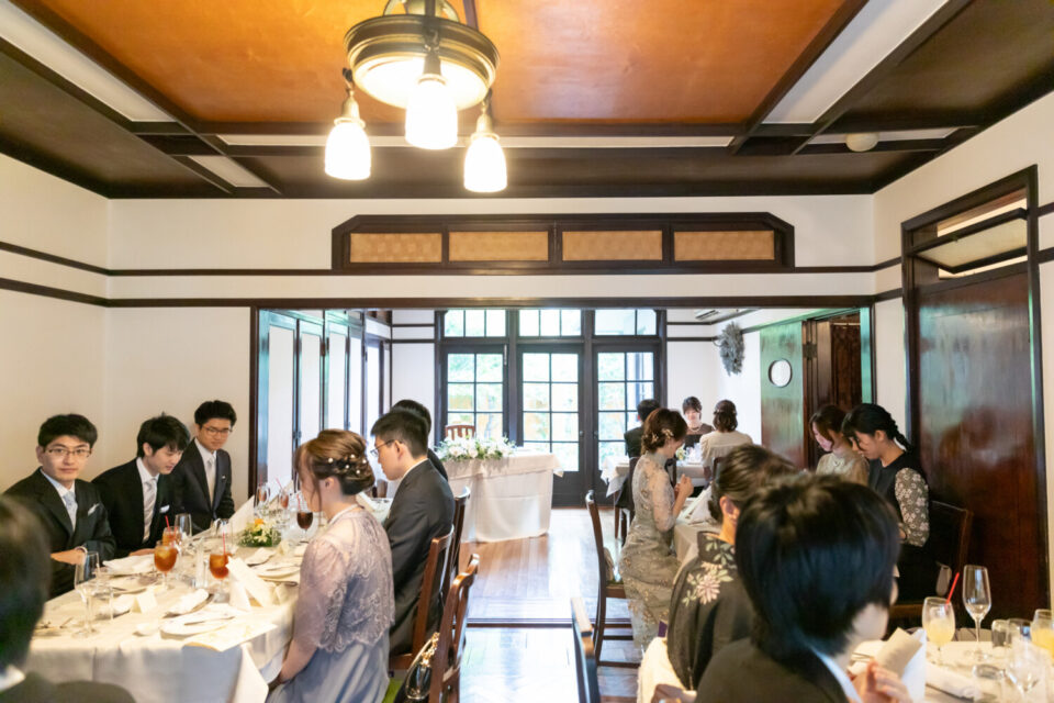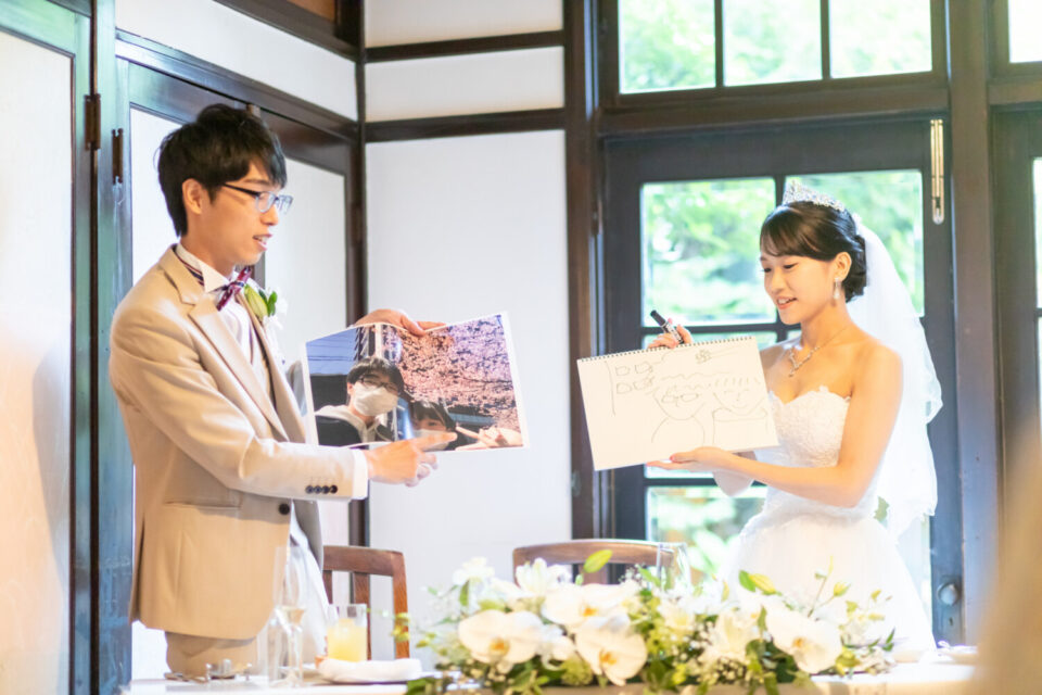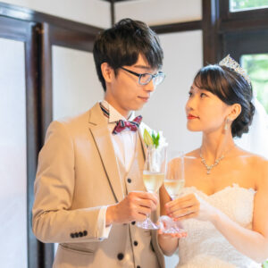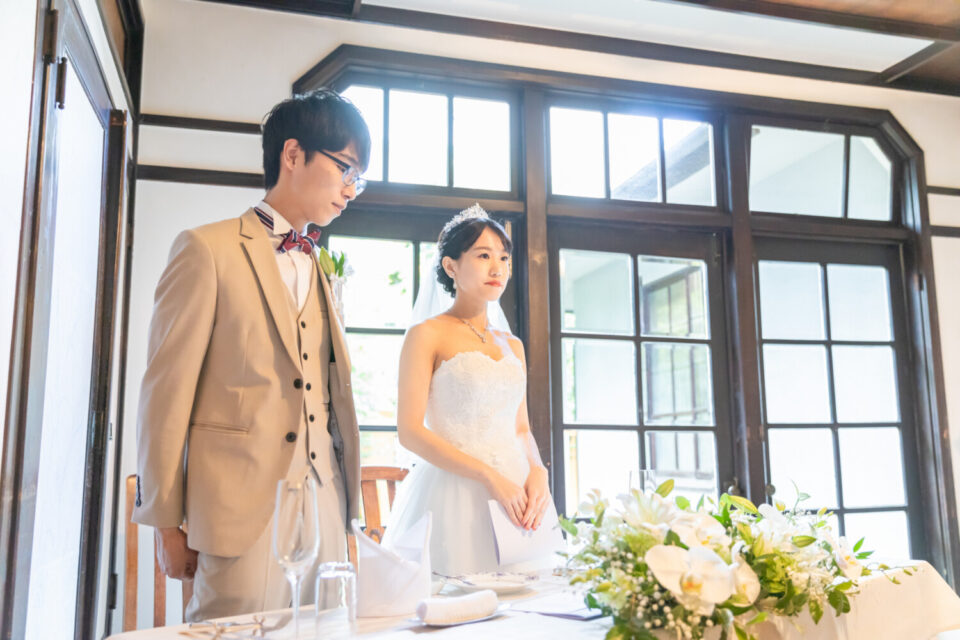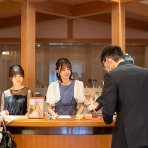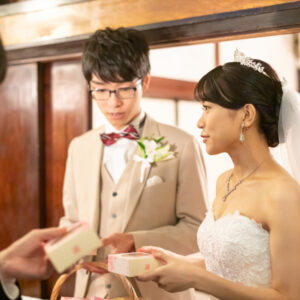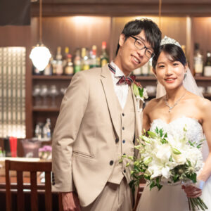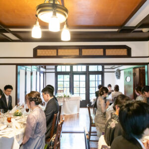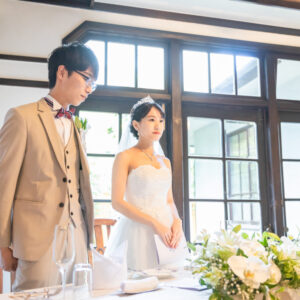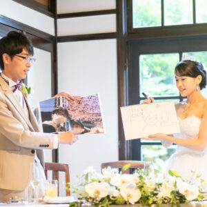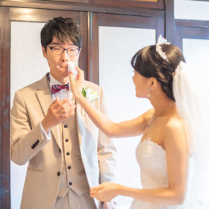 名古屋城の近くでの結婚式を希望していたおふたり。世界最大の能楽堂といわれる名古屋能楽堂での結婚式を実施されました。特別な場所での結婚式をしたい、そんな想いのあったおふたりにはぴったりの場所。凛とした空気、そして、これからのおふたりの誓いを宣言し、ゲストへと届ける舞台としてはこれ以上の場所はないと、ゲストも大変よろこんでいらっしゃいました。その後は、レストランに移動して、おふたりがまるでご自宅にお招きしたかのような雰囲気の中、お食事を召し上がっていただき、イベントなども行いながら、みなさまとリラックスしたお時間をお過ごしいただきました。