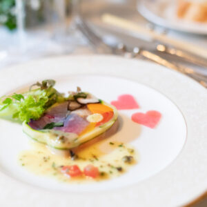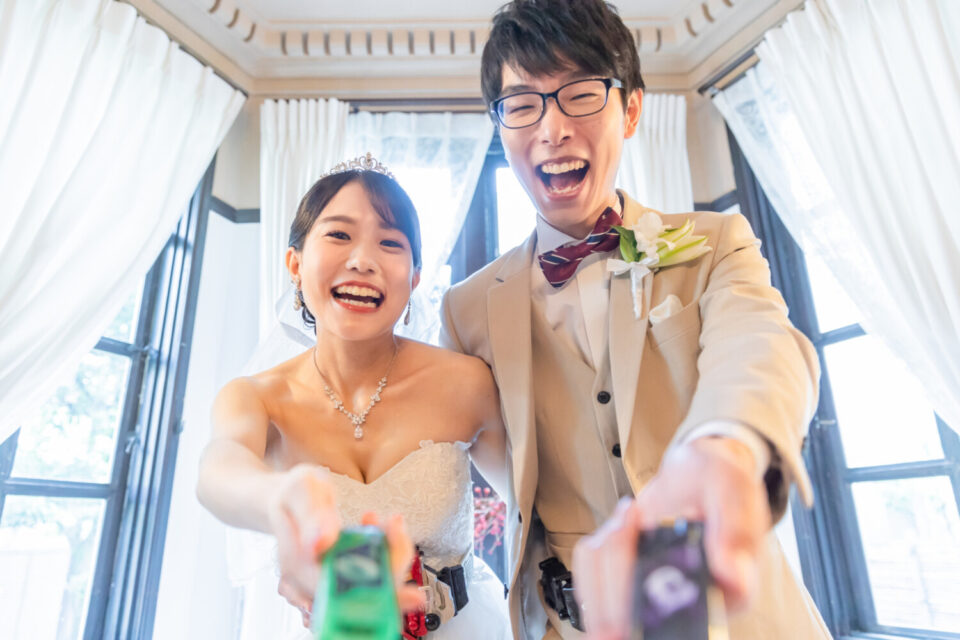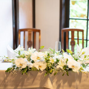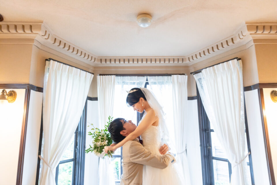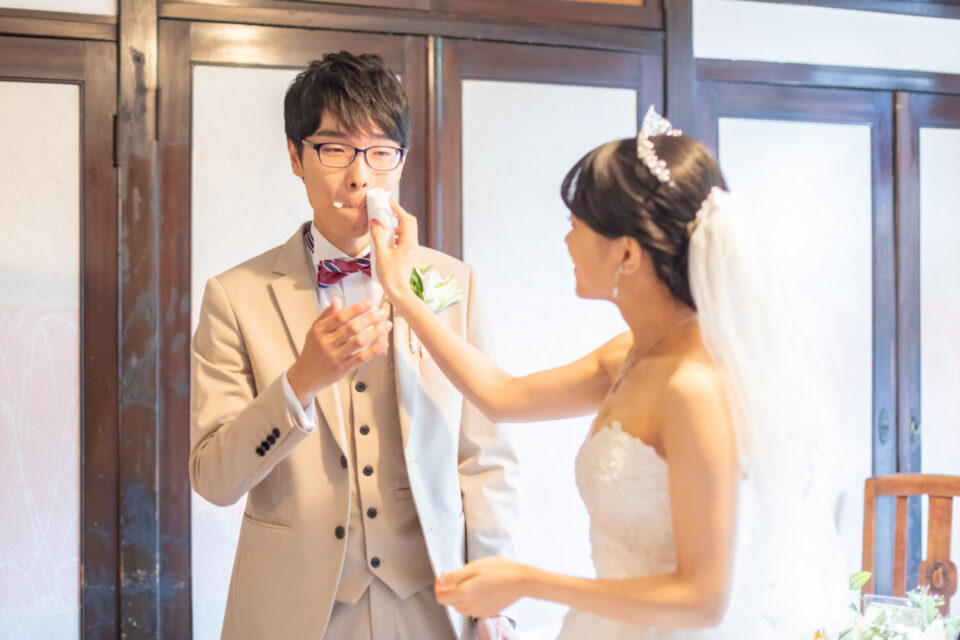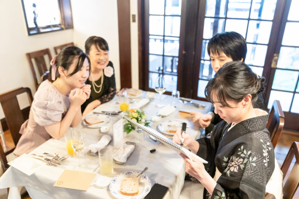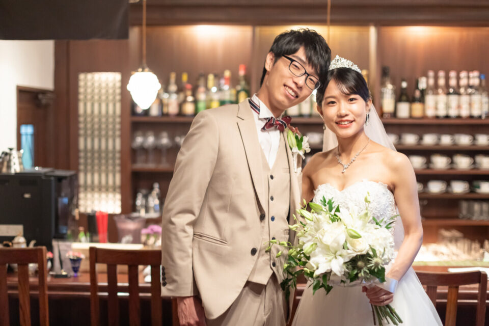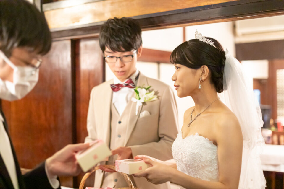 名古屋城の近くでの結婚式を希望していたおふたり。世界最大の能楽堂といわれる名古屋能楽堂での結婚式を実施されました。特別な場所での結婚式をしたい、そんな想いのあったおふたりにはぴったりの場所。凛とした空気、そして、これからのおふたりの誓いを宣言し、ゲストへと届ける舞台としてはこれ以上の場所はないと、ゲストも大変よろこんでいらっしゃいました。その後は、レストランに移動して、おふたりがまるでご自宅にお招きしたかのような雰囲気の中、お食事を召し上がっていただき、イベントなども行いながら、みなさまとリラックスしたお時間をお過ごしいただきました。