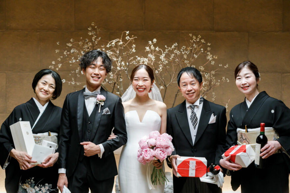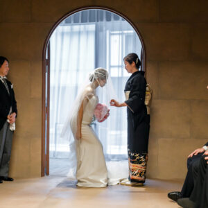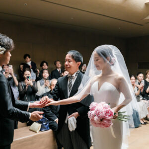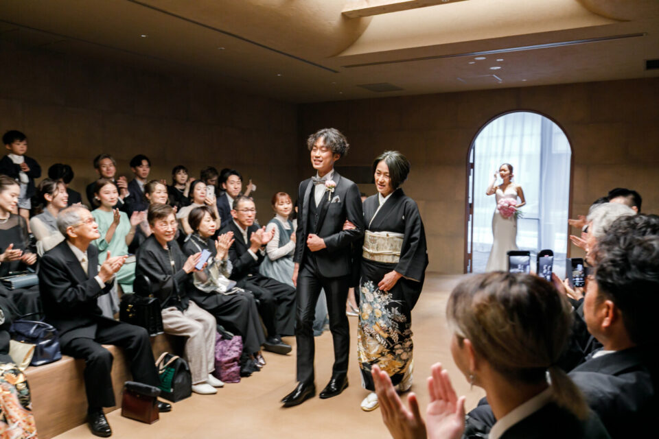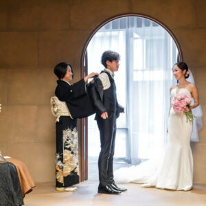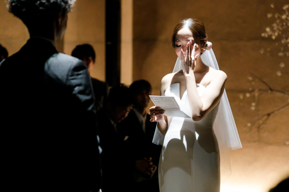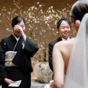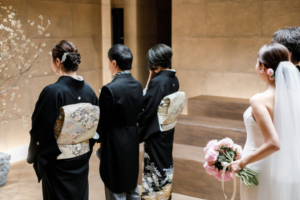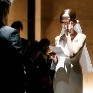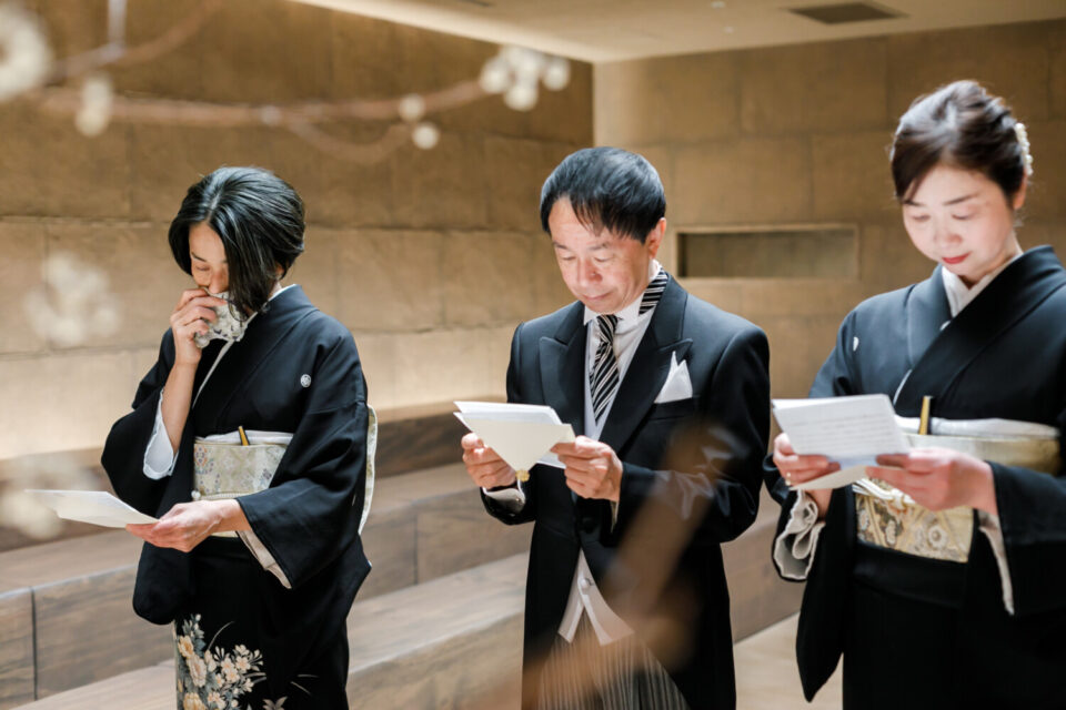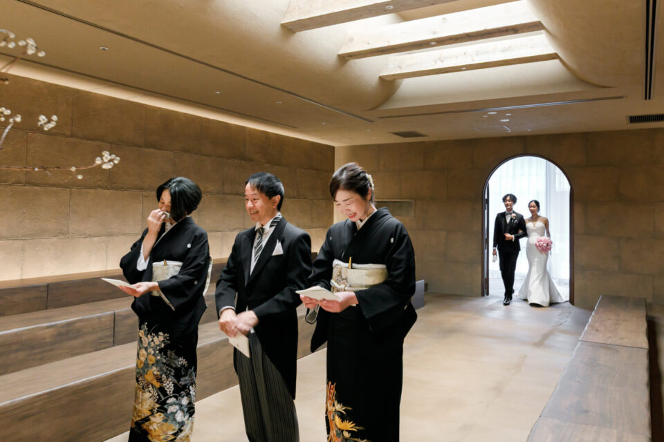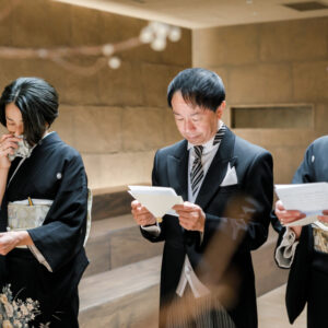 挙式前には親御様とのファミリーミートを設け、あえて対面前に手紙を読んでいただき、おふたりの想いを受け取った上でご対面のシーンを設けました。ご自身だけでなく相手の親御様にもお手紙をご用意され、「これからよろしくお願いします」そんな想いを込めました。