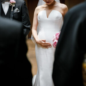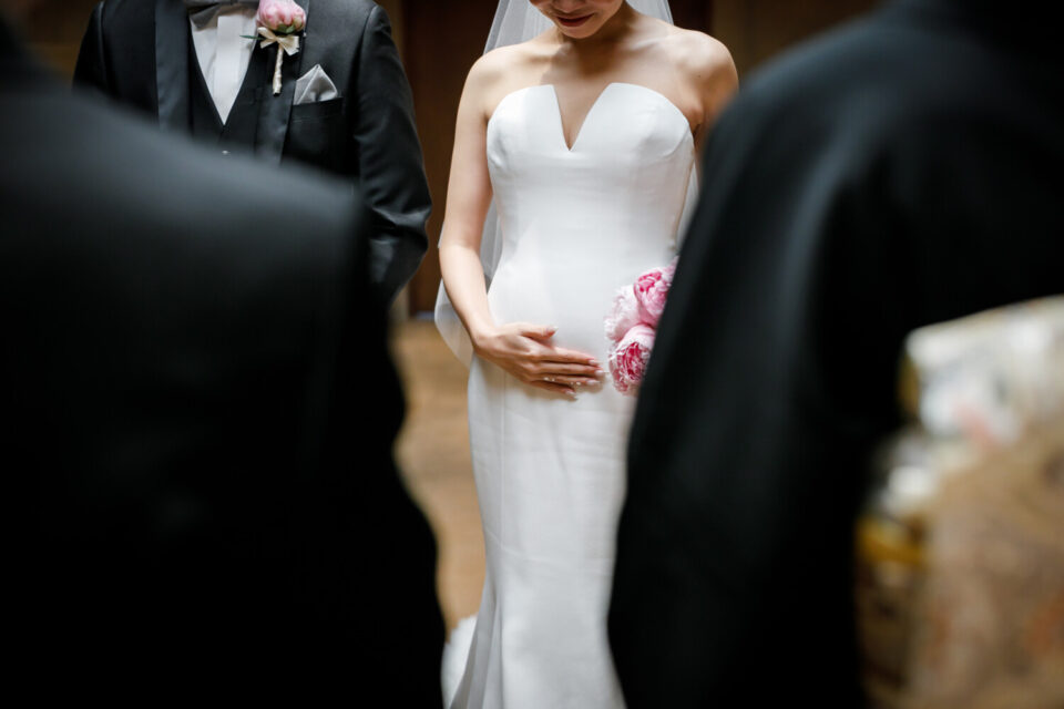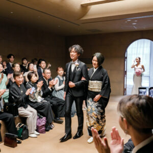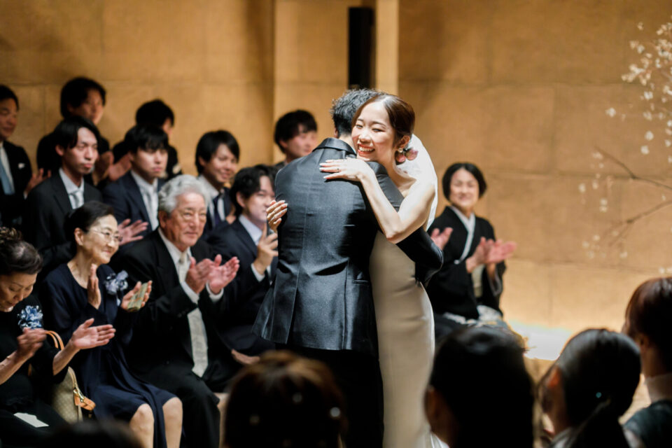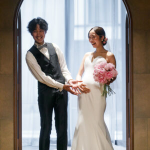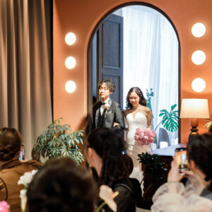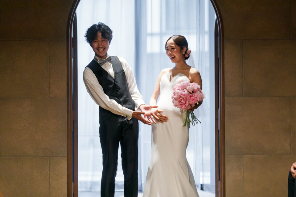 ご結婚式準備を進めていく中で大切なお子様を授かり、当日までゲストにはサプライズにしていた為、挙式入場前にお手紙で感謝の気持ちとともにお伝えしました。おふたりが入場した瞬間、大きな歓声と思わず涙するゲストの方もいらっしゃり、大変温かい空間でした。