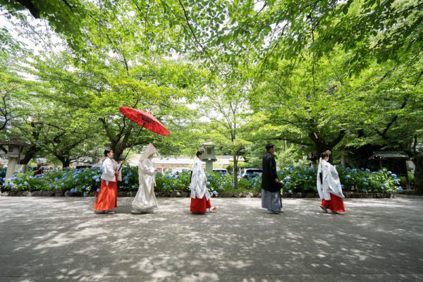 お支度中のおふたりの自然な笑顔や、この季節ならではの紫陽花をバックにしてのお写真も。