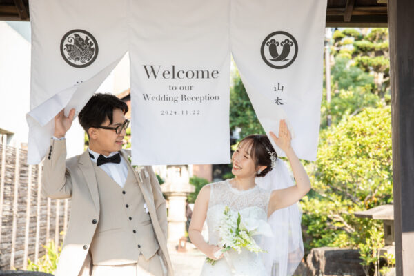 ご両家の家紋が入った暖簾でご家族をお迎え。挙式では、新郎新婦から親御様への想いを伝える時間を入れ、おふたりにとってもご家族様にとっても、思い出深い節目の時間となりました。親御様から新郎新婦へ応援のメッセージもいただき、大切なご家族と想いを分かち合えた瞬間はかけがえのない時間になりました。