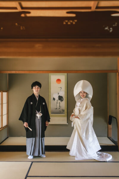 花嫁しか着れない白無垢が着たくて、【白鳥庭園】にて和装での撮影。広い敷地内では、素敵な背景がたくさんあり、和の庭園や建物を背景に撮影を。新婦のおばあ様が新婦の為に選んで用意してくれた白無垢を着て、色の小物は追加せず、思いっきり「純白」の花嫁になり思い出を残しました。撮影にはご家族も参加され、一緒に撮影したりと和やかな時間を過ごされました。