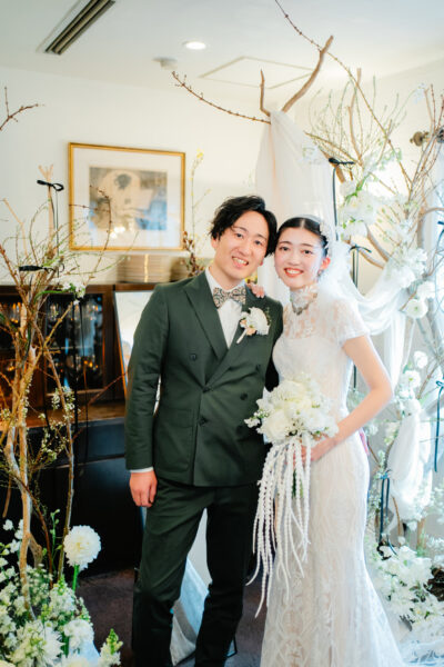 当たり前の固定概念を無くし、純粋にゲストとの時間を大切にしたいという想いから、おふたりの高砂は席としてではなく、フォトスポットとしてご用意しました。常にゲストと近い距離で過ごすことができ、またゲストインタビューもメインではなく、ゲストのお隣でお話をお聞きし、心の距離がグッと近くなる時間を過ごしました。