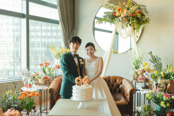 オープンレターで、ゲストへの想いを伝えた上で挙式の入場。ゲストからはおふたりへの想いをパーティ中に届けてもらいました。エスコートカードは、本の形にして物語の始まりを演出。披露宴後半は、真っ赤なドレスで彩りを加え、リンゴブーケに合うスタイリングに。