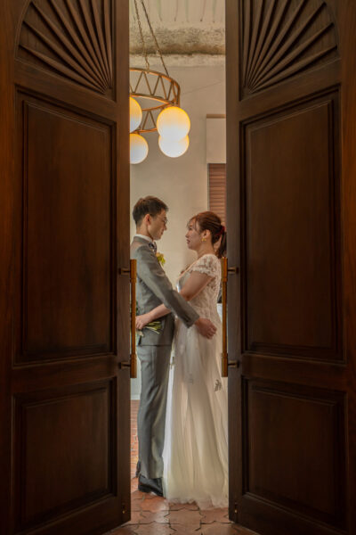 荘厳な雰囲気の市政資料館で、おふたりの未来を大切な家族の前で誓いました。挙式後はゲストと一緒に花嫁行列でレストランにご移動。デュボネでは、おいしいお食事でゲストをおもてなし。大切なご家族にこれまでの感謝の気持ちを伝えました。