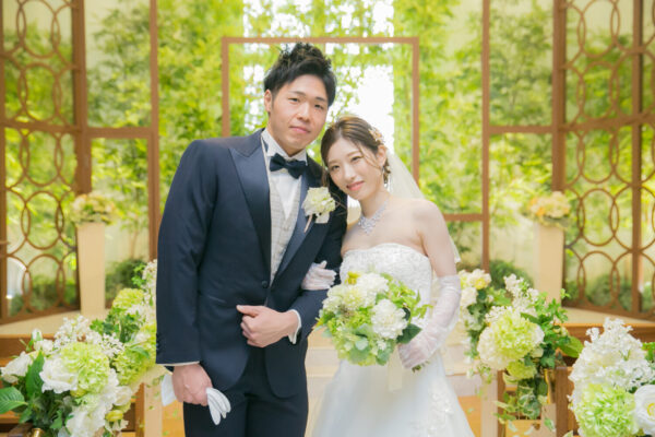 挙式はワンちゃんにも挙式に参加してもらえる会場をセレクト。親族のみの参加にし、メッセージムービーなどを使って、しっかり感謝を伝える場を作りました。一方パーティーはカジュアルな雰囲気で楽しく過ごされたいというご希望から、親族・友人をご招待し、空気感・雰囲気を変えました。友人へは気持ちを伝えるメッセージカードをご用意しました。