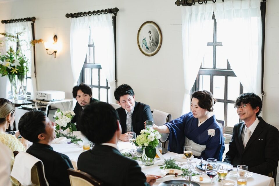 例えば、マイクで一つ一つ確認をしなくてもアイコンタクトで合図を出す連携プレーだったり、楽しい雰囲気とお酒でフラフラされているゲストがいれば、さっとお水とおしぼりを出してくれたり、過ごしやすいように、テーブルを綺麗に整えてくれていたり、お手洗いの案内はもちろん、戻ってきたらお子様でも椅子を引いてくれるんですよ。
