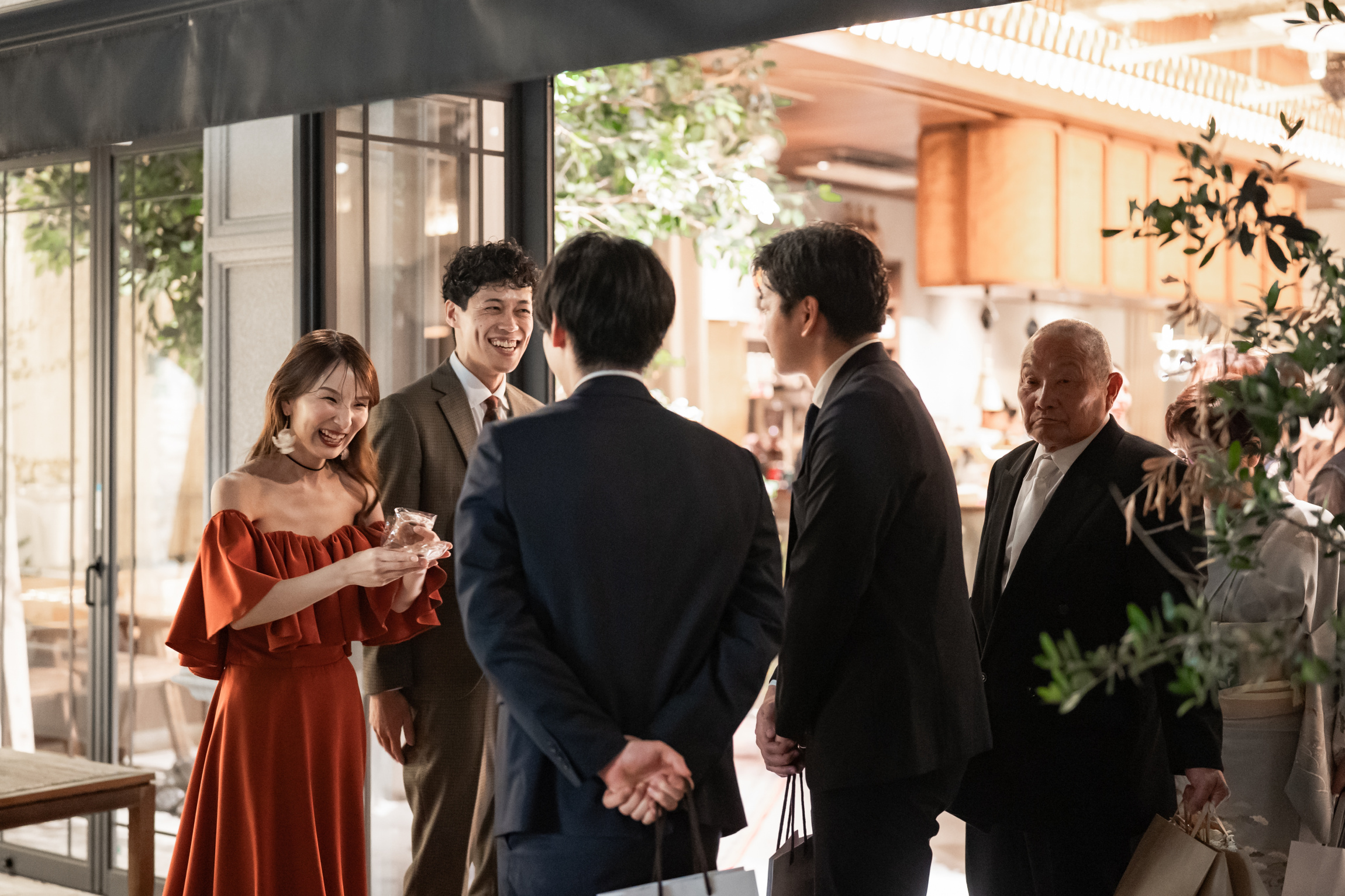 おふたりの大切な皆様が一斉に集まる一日だからこそ、ゲストの皆様と一緒に楽しめる時間を軸にしたいという想いからゲストの皆様を新郎新婦がお出迎えしました。そうしたことで、式が始まる前から距離の近さを感じていただき、パーティーが始まるワクワク感を高めるお時間となりました。入場後は小さいころからのご友人からのお手紙を受け取りこれからもよろしくね。と心通わせる温かい空間をお届け。