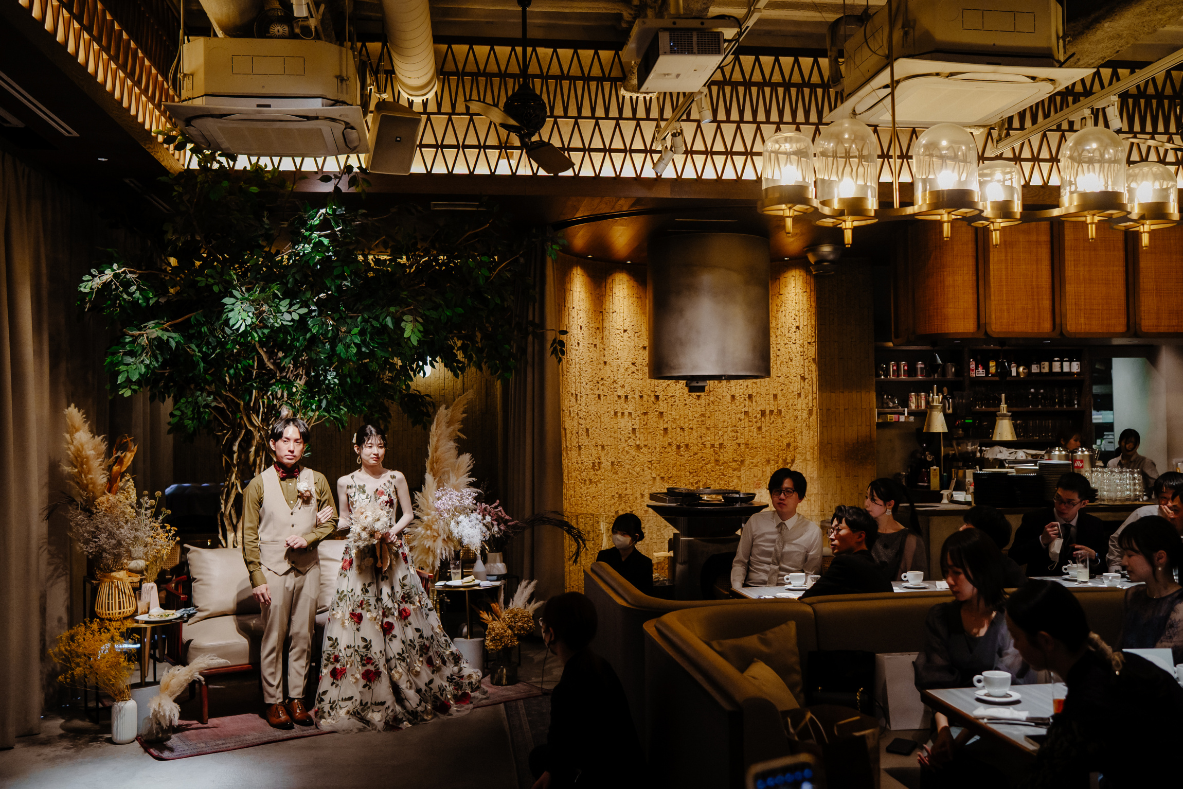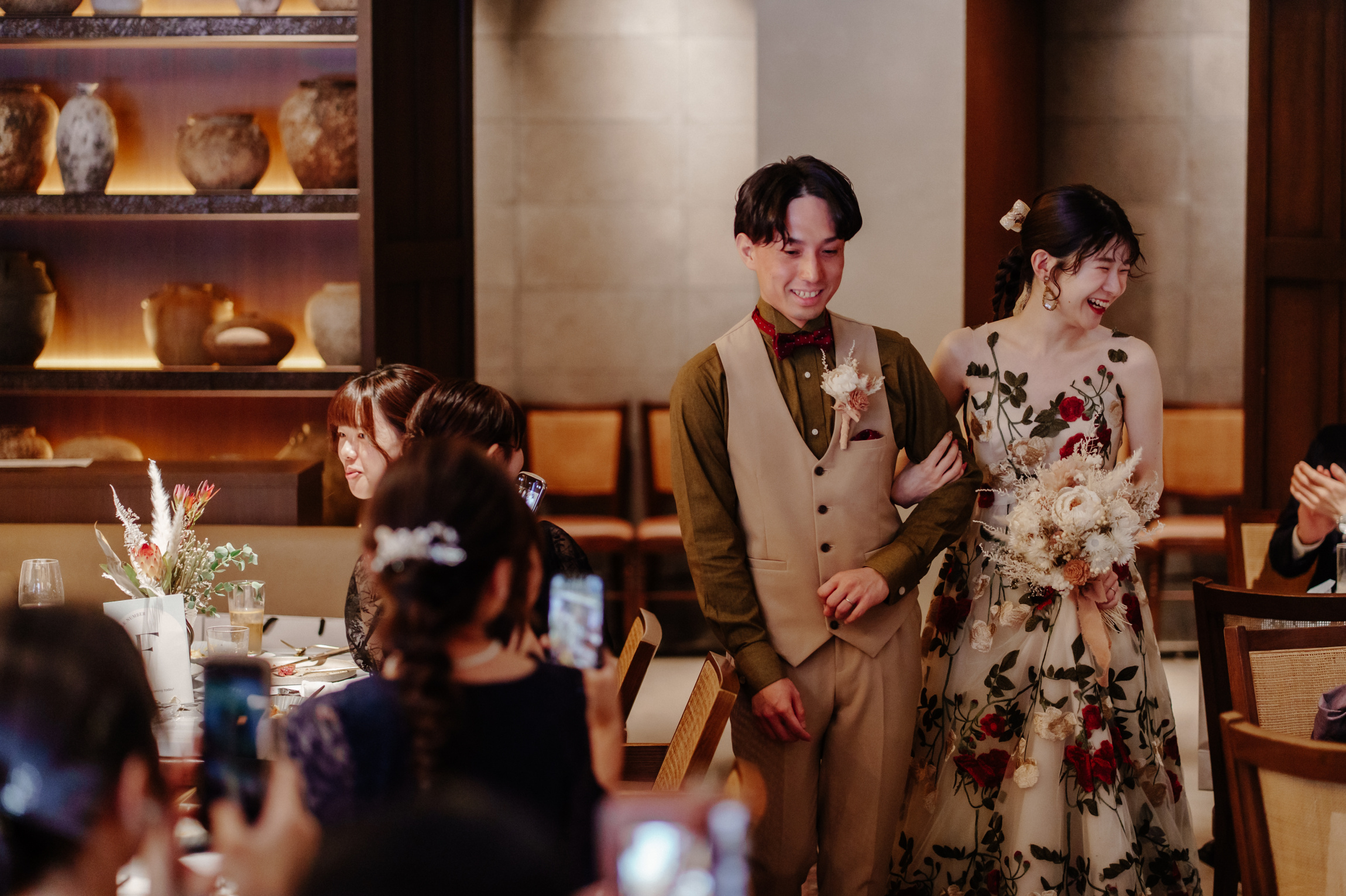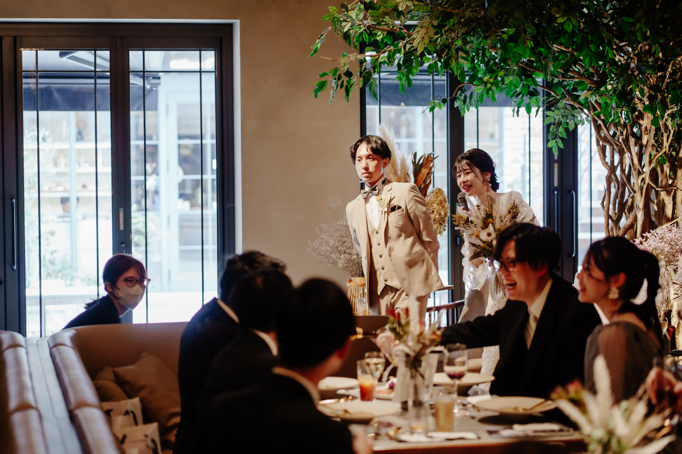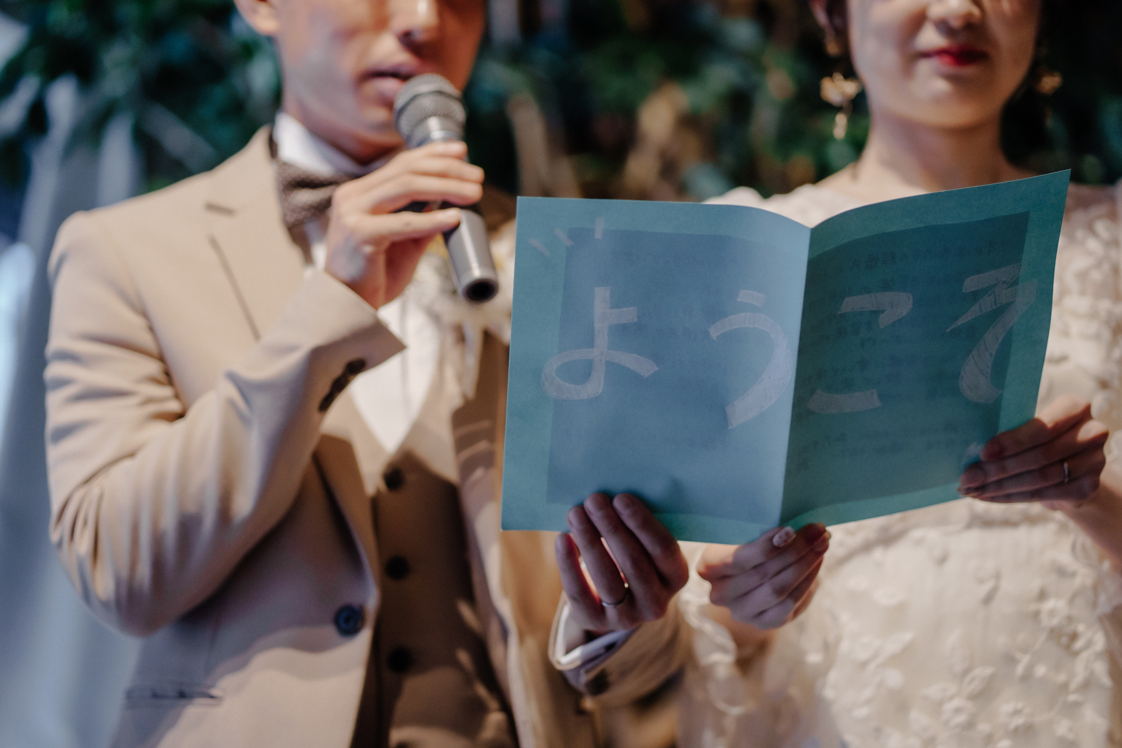 ひとりひとりに向けたメッセージをエスコートカードに仕込んだり、BGMを通して音に感謝の思いを込めたり…ひとつひとつのアイテムが大切な人たちに幸せを届けられるように、全員と顔を見合わせてゆったり過ごす時間、ふたりならこれからも大丈夫と思ってもらえるようにと、ふたりからとゲストからの愛情に溢れたあたたかい時間となりました♡