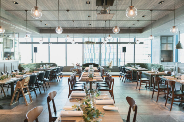 グレーを基調とした店内と古材の持つヴィンテージ感、そして自然を意識した豊かな緑の家具が相まって、ナチュラルながら都会的な雰囲気を醸し出しています。見渡しのいいワンフロアでカジュアルでオシャレなパーティーを。