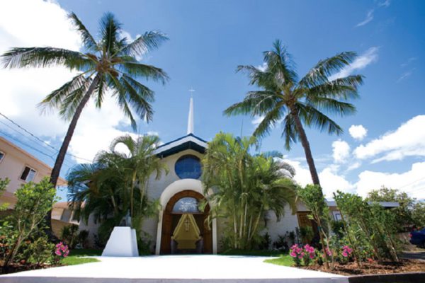 幸福の鐘があり、内観は木彫りでハワイらしい温かい雰囲気です。