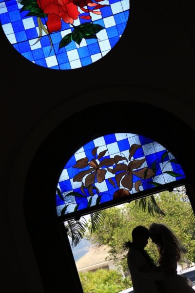 教会入り口には、ハイビスカスを描いた丸いステンドグラスや