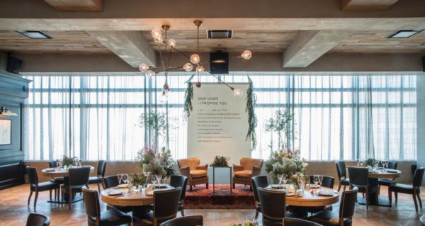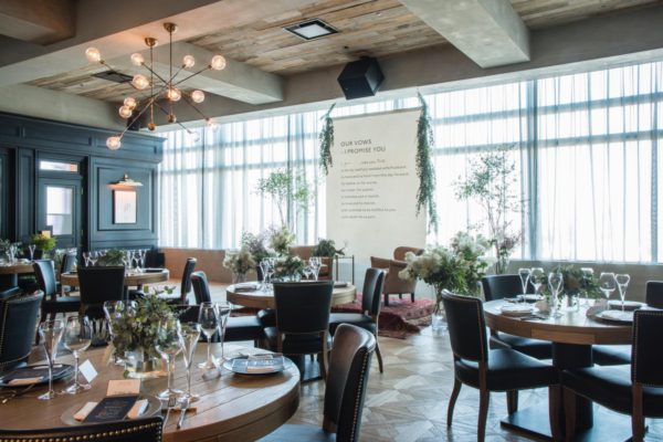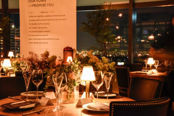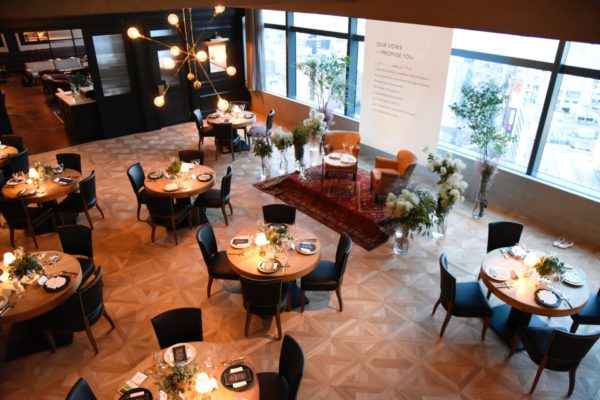 大きなアートピース、ミラーのある個性的なバンケット、名古屋の景色が一望できる落ち着いた雰囲気のレストランです。天井が高く、ナチュラルなウッドカラーで統一された空間には、お好きなカラーをプラスしておふたりらしいコーディネイトで大切なゲストをおもてなしすることが出来ます。