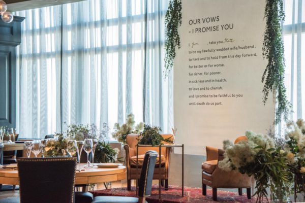 ゲートタワーの15階のつきあたり、広々としたエントランスをくぐると、タイル貼りの贅沢なスペースが現れ、ラウンジ&バンケットをつなげると最大100名様まで着席可能。おふたりのお気に入りの写真を並べたコラージュウォールや、プロジェクターで映し出すウエルカムサインなど、大勢のゲストを迎え、期待感を高めた贅沢なウエディングを。